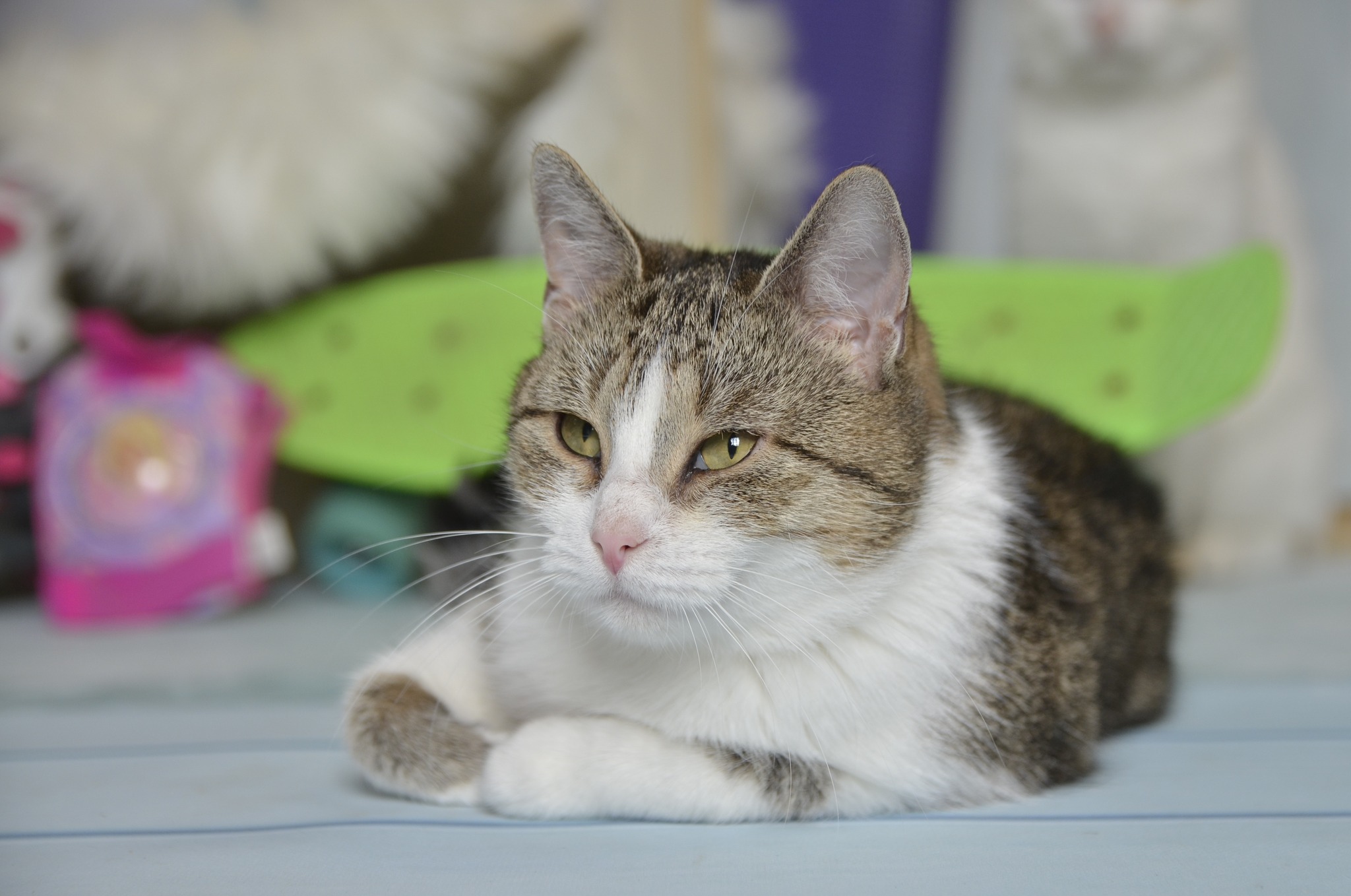 Myszka źle znosi pobyt w zatłoczonej kociarni, szuka sposobności aby być blisko człowieka i przy nim czuje się najlepiej, najbezpieczniej...